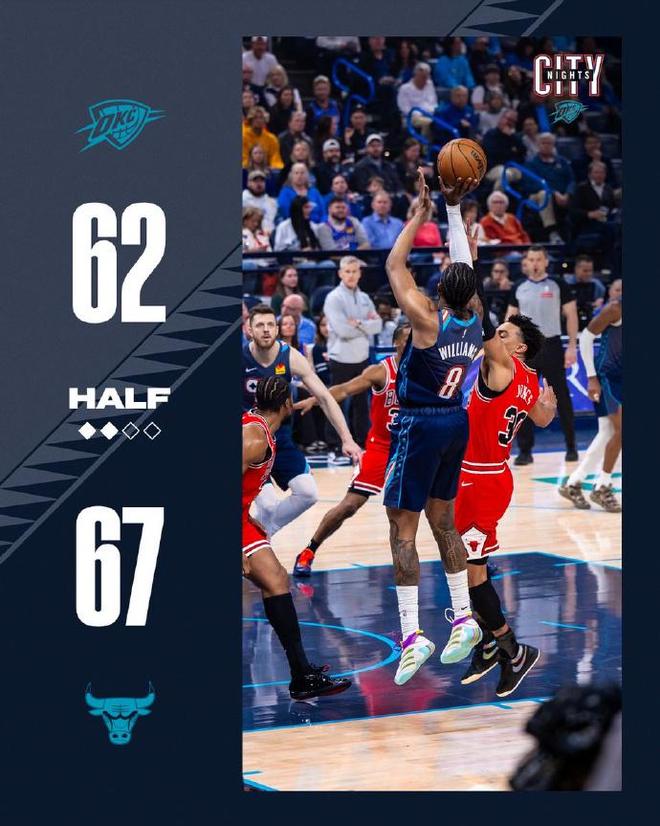 次节比赛,双方均是单节得分30+展开对攻,但公牛本场首次单节得分35分。亚历山大继续外线打铁,前两节比赛公牛三分24中12,奥科罗17分、塞克斯顿6中6命中4记三分得到16分与米勒10分、吉迪4中1仅得到3+4+6。反观雷霆三分24中7,亚历山大14中5(三分7中0与罚球3中1)得到11分、杰伦11分与华莱士10分。雷霆单节33-35再输2分,上半场结束雷霆62-67落后公牛。